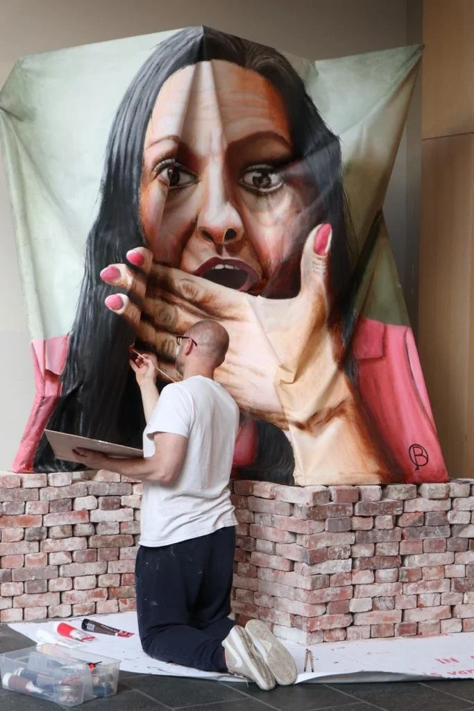 A number of local artists were asked to think about making a work of art related to the renovation of the cultural centre De Adelberg in Lommel Belgium. The existing building would be partially demolished and then rebuilt. The exhibition took place shortly before the demolition, for that reason I chose to collapse a painting of 200 x 200cm with a portrait of the managing director of the cultural centre.
